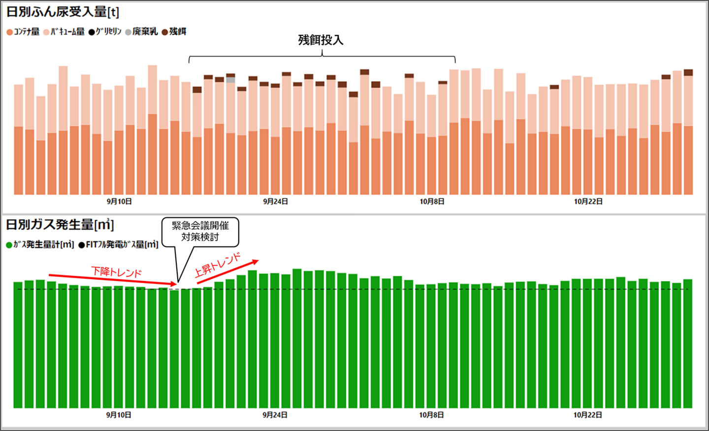 ガス量低下トレンドを素早く察知し、関係者への説明そして対策の実行とBIサービスを活かした改善を行った好例です。
